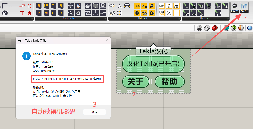 拖入”Tekla 汉化,点击关于,已自动复制机器码.